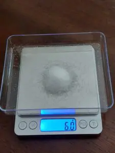 Once your scale stays steadily on 0 (with the tray or measuring bowl on it), you can start measuring. In this photo, we measured out 6 grams of NaCl (AKA regular table salt). Because the scale was reset before measuring, we know that 6 grams is an accurate measurement.