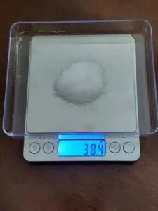 If you don’t use the tare function and reset your scale, your measurements can be vastly inaccurate. This photo shows the same amount of salt measured on the scale. However, in this case, the scale wasn’t recalibrated. As a result, the final (albeit inaccurate) measurement shows 38.4 grams.